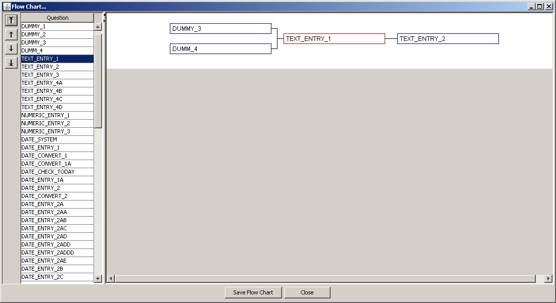 Displays a flow chart in a new window of the lead-in question(s) and next question(s) for the question currently being viewed in the CAPI Designer. Same command as the Flow button found on individual question record screens.